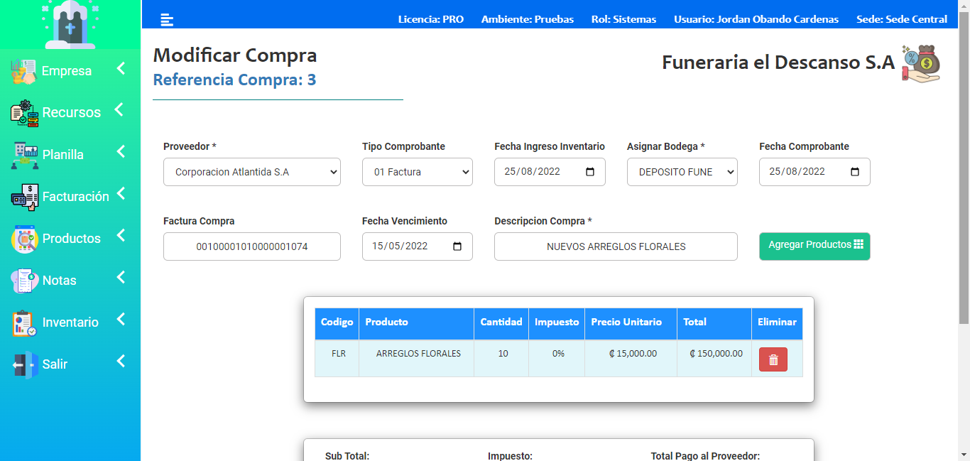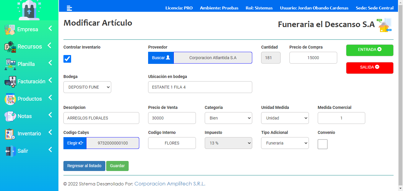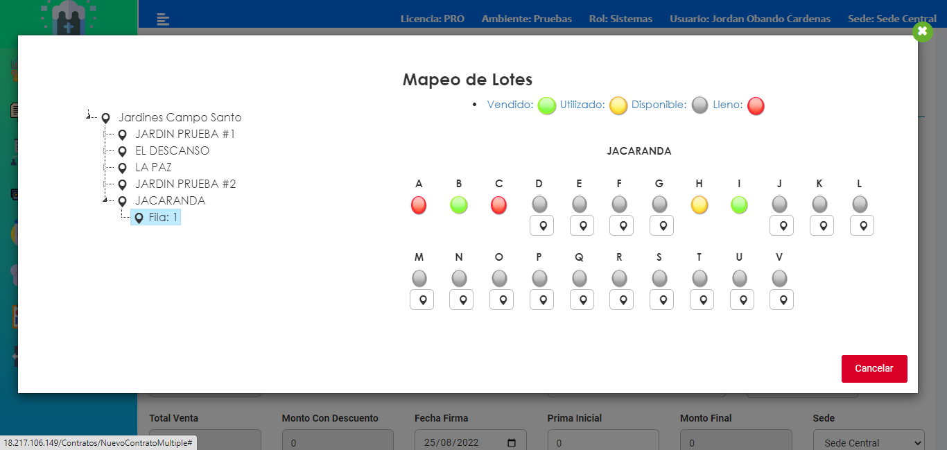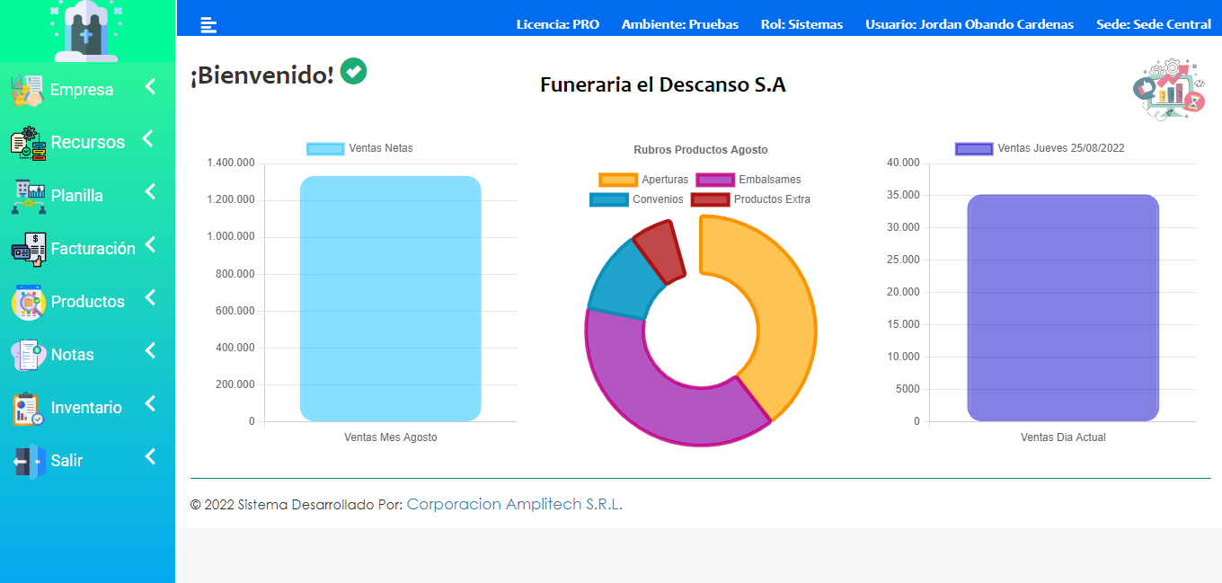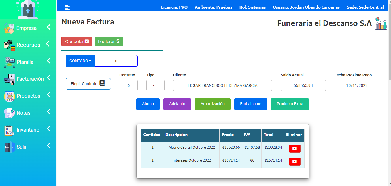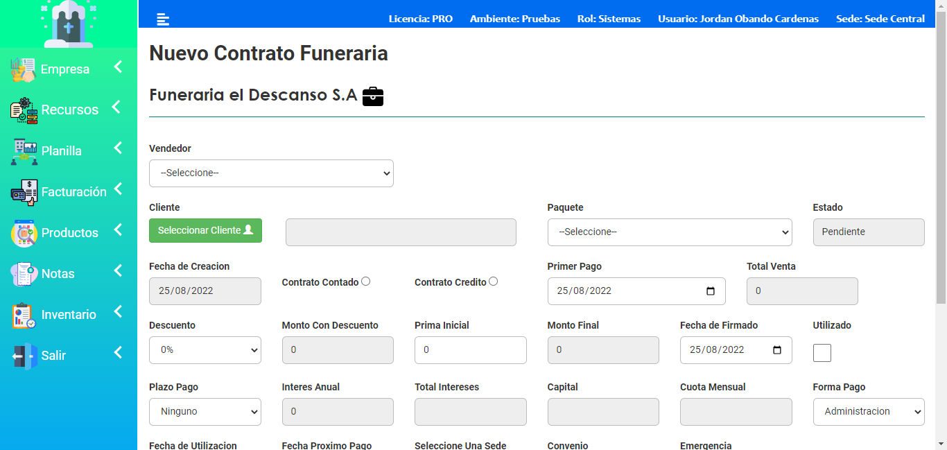 Contamos con un novedoso sistema para la administracion general de campo santos, funerarias y crematorios permitiendole tener el control general de clientes, contratos, aperturas, cremaciones, escrituras, facturacion electronica, inventario de lotes y productos, comisiones de ventas, compras, reportes, notas de credito y debito entre muchas funciones adicionales.